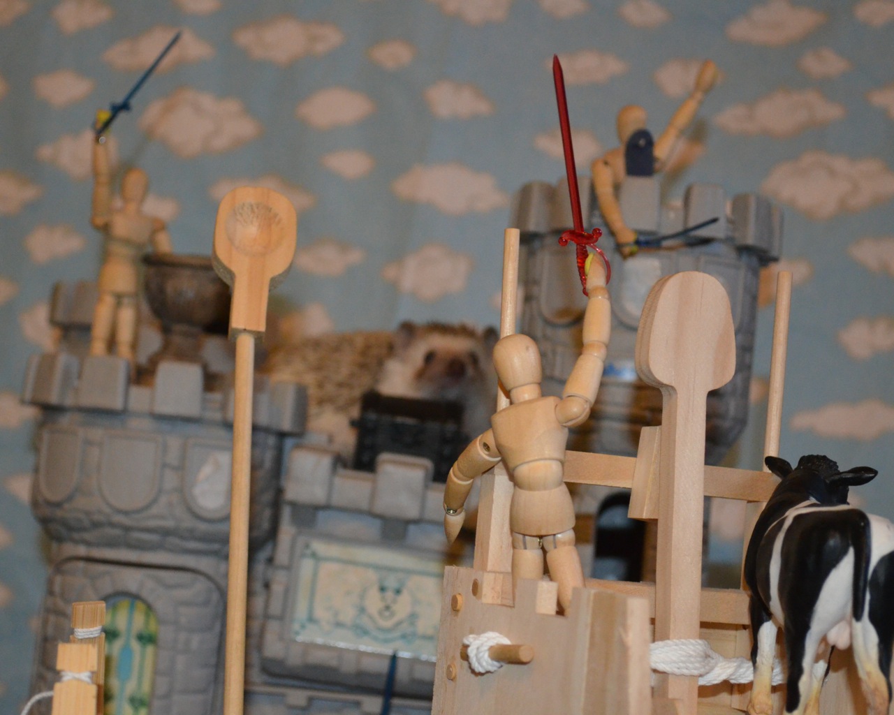 Princess went and found the cows. Together they formed The Cows Of The Round Table (the members were not all cows, but Cows, Baboon, and Hedgehog Of The Round Table just didn’t roll off the tongue). Together, they planned a great battle – a siege against Castle Mittens to defeat the wicked cat and bring justice and order back to the farm, then Princess granted them knighthoods authorizing them to serve in the battle. She looked up the wikipedia page on knighthood to see if they had the details of the ceremony, but it was missing most details, so she winged it.