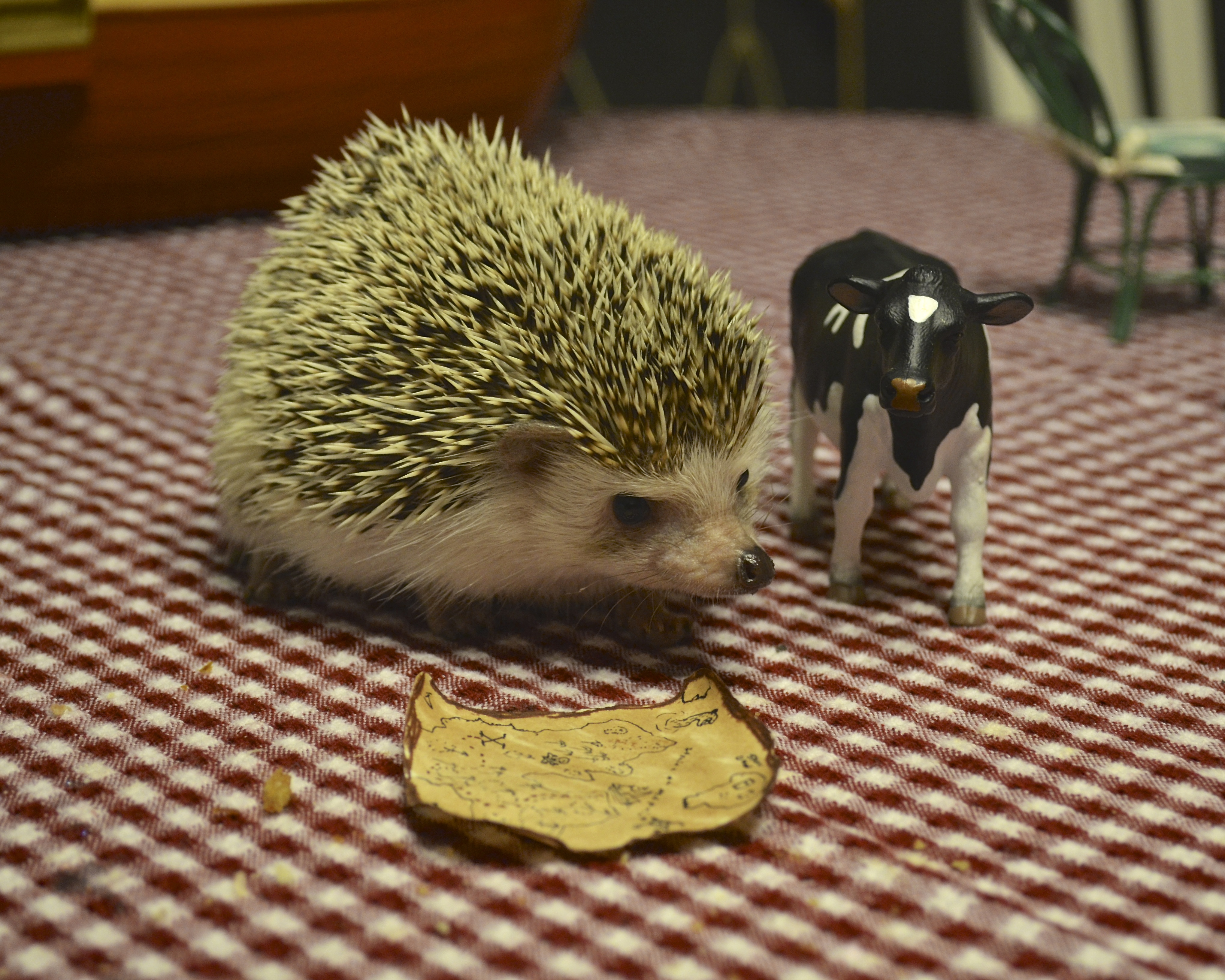 Dear Misunderstood, Hedgehogs have very poor eyesight, which makes reading much harder for them.  Sorry if there were any misunderstandings.  Due to their poor eyesight, they rely on their sense of smell to guide them.  It smells like you like pirate maps a lot, which is great!  I didn’t exactly have a lesson to offer here, but wanted to show you this lovely and delightful pirate treasure map that I skillfully negotiated away from the others.  Please ignore the dead cow (and the Witch Scale) in the background, the poor lighting, the distracting elements in the scene, and the other things that annoying photographers might bring up.