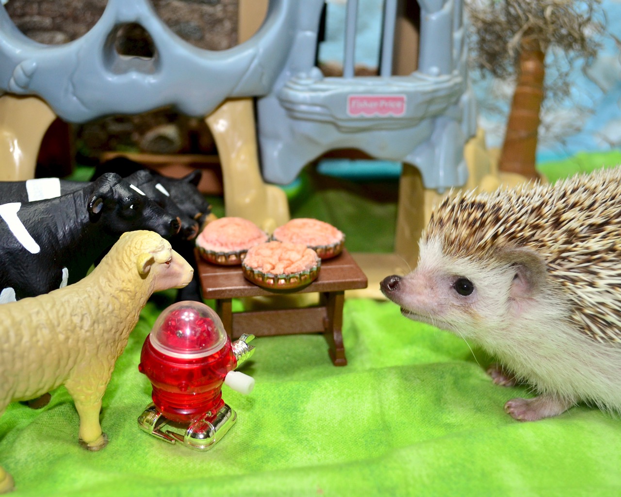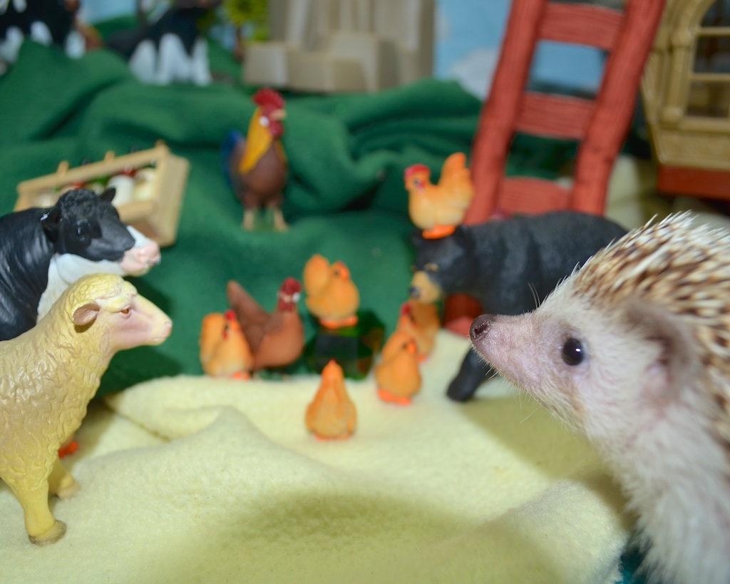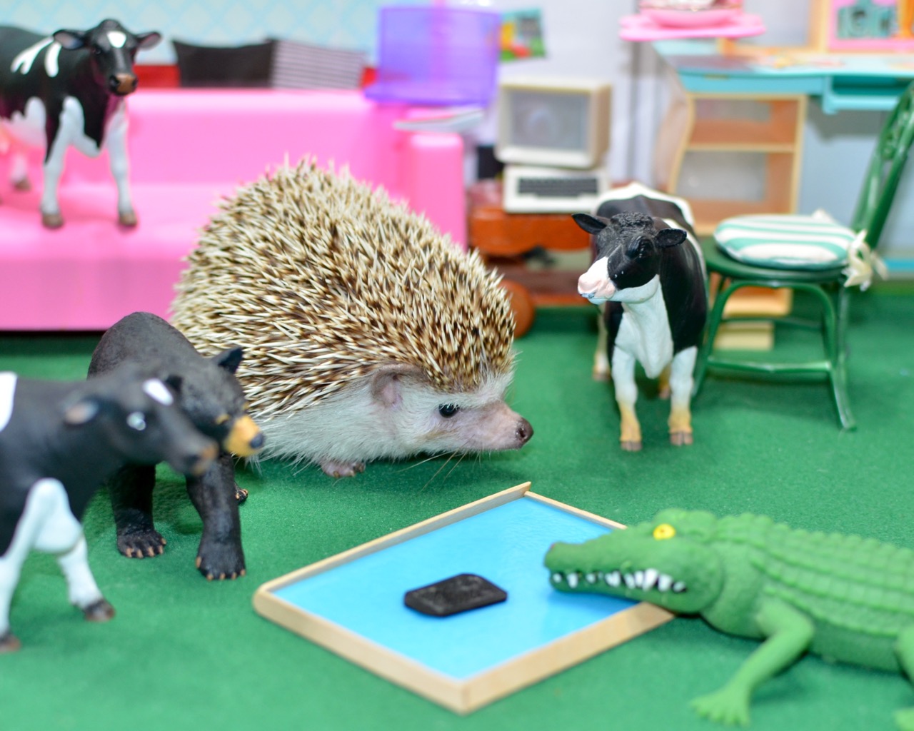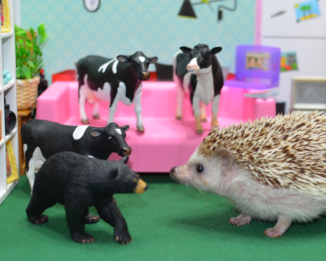 Princess Pricklepants, Boris the Canadian Existentialist Bear, Jane the Cow Accountant, Bessie the Generic Cow, and Christine (Cow Safety Officer) were sitting around the living room.  Her Highness was displeased.  The hat she trying on was really not working, but the boutique it had been purchased from had a No Pets Allowed policy, so she’d need to send the hand servants along to sort things out again.  Usually she accepted these things with the dignity and grace befitting a hedgehog of high station, but this time this indignity, this utter injustice of Pet Prejudice touched a tipping point.