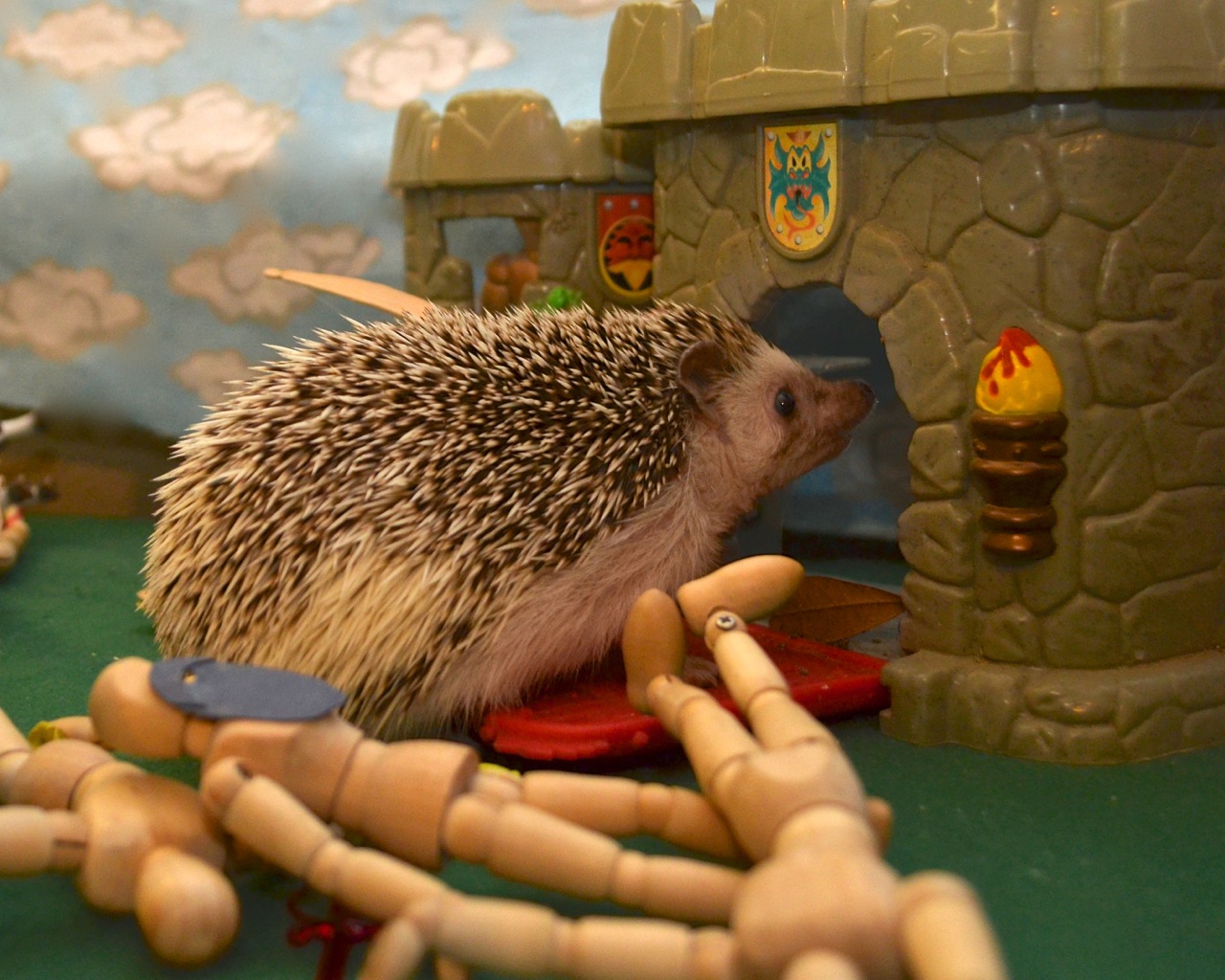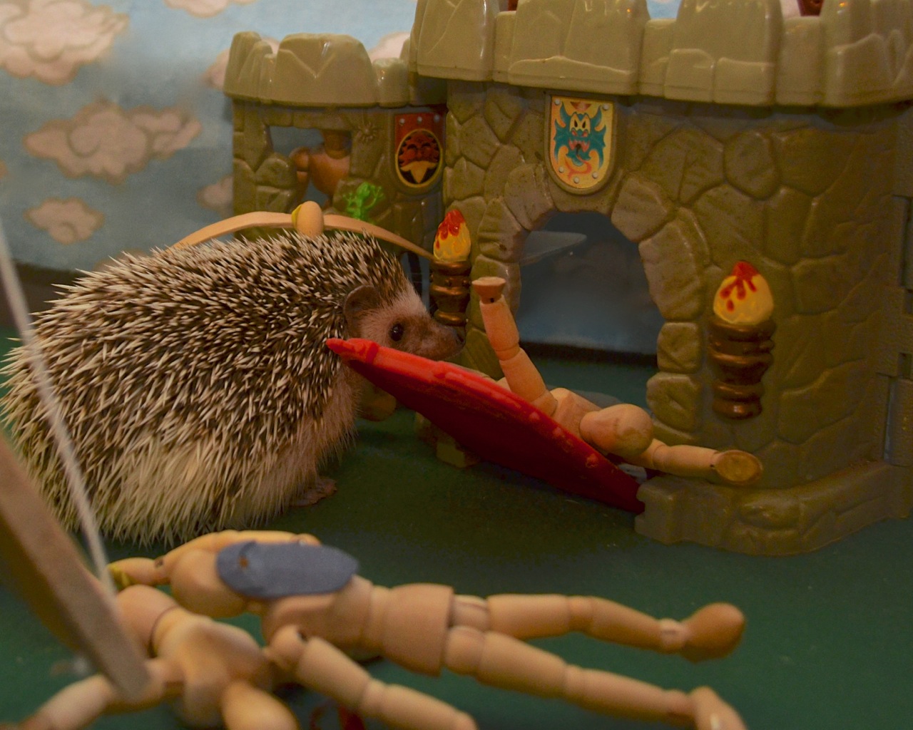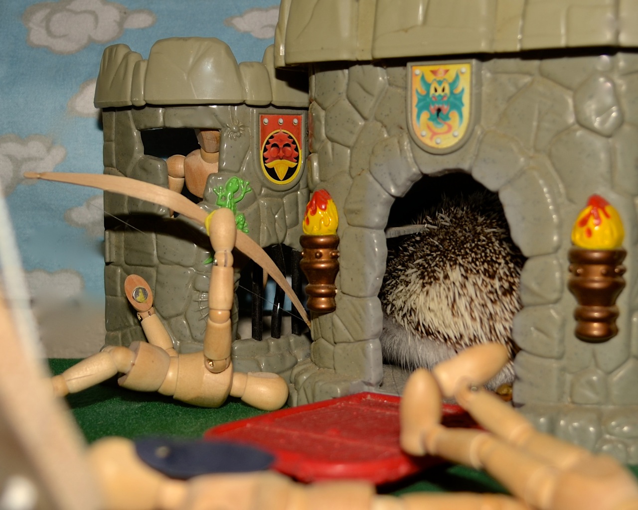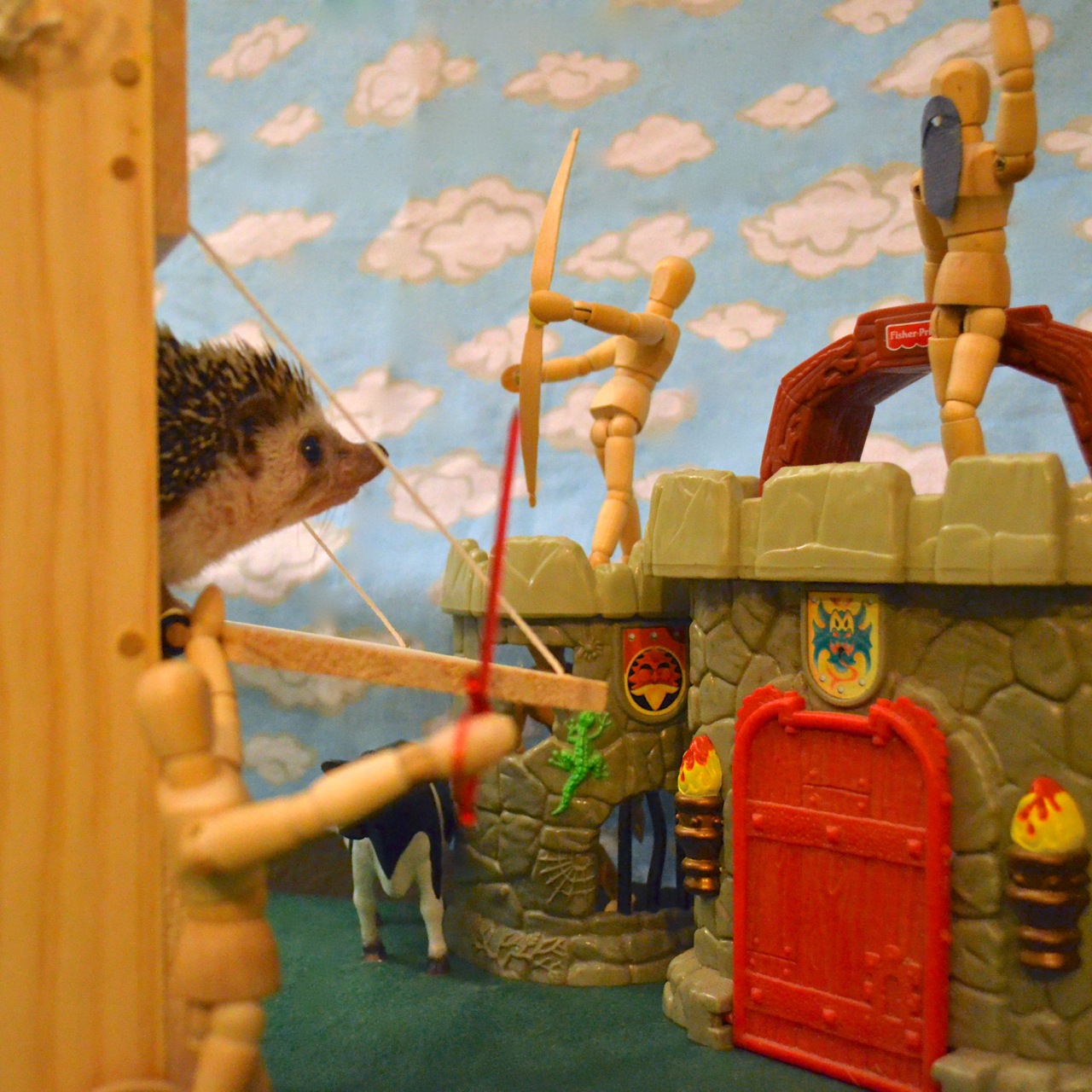 The crocodile-laden hedgehog war tower (and orderly row of cows) struck fear in the heart of art model and cat alike. They fled in terror, never to return in all likelihood.